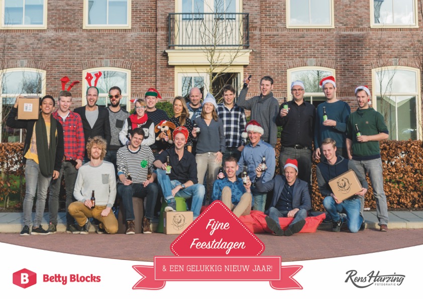 Het volledige team van Betty Blocks ging samen op de foto. Deze foto werd op hoge kwaliteit op A4 gedrukt en bovenin de Box gelegd.